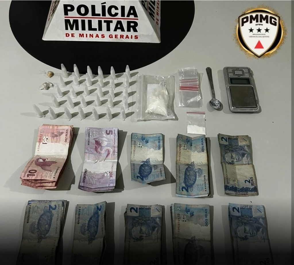 Com eles, os policiais encontraram 31 pinos de cocaína, duas pedras de crack, balança de precisão e dinheiro