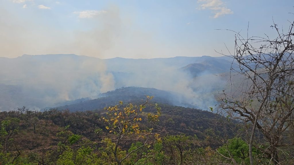 Um incêndio de grandes proporções continua destruindo a vegetação na Serra da Calçada entre os municípios de Brumadinho e Nova Lima. O fogo que começou na última quarta-feira, 1º, ganhou força em direção ao pico da serra. Brigadistas e bombeiros conseguiram controlar a linha de fogo que seguia em direção as regiões dos condomínios.